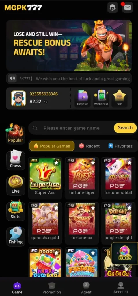 MGPK777 Game APK is an online gaming platform that brings together dozens of entertainment categories under one app. It includes slot games, card games, arcade games, fishing games, and popular prediction-based games. The platform allows users not only to enjoy gaming but also to earn real money through gameplay and referral programs.